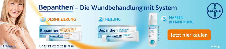 Bepanthen® ist eine der führenden Marken im Bereich Wundheilung und -versorgung und hat sich aufgrund seiner pflegenden, feuchtigkeitsspendenden und heilungsfördernden Eigenschaften seit Jahrzehnten bewährt. Weil unsere Haut Tag für Tag Erstaunliches leistet, weil sie durchgehend Umwelteinflüssen ausgesetzt ist und bei Unfällen und Stürzen nur allzu schnell verletzt wird – aus diesen guten Gründen steht Ihnen Bepanthen® mit dem gut verträglichen Wirkstoff Dexpanthenol als zuverlässiger Begleiter in jeder Situation zur Seite: Ob im Alltag, unterwegs oder auf Reisen.