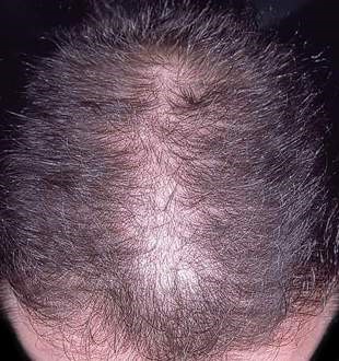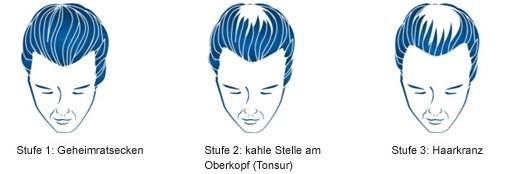 Im ersten Schritt bilden sich an den Schläfen Geheimratsecken. Später kommt es am Oberkopf zu einer kahlen Stelle, die sich immer weiter ausweitet. Schließlich bleibt nur noch ein Haarkranz.